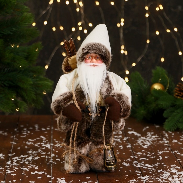 Дед Мороз "В пушистом колпачке, с фонариком и подарками" 28 см, двигается, серо-белый