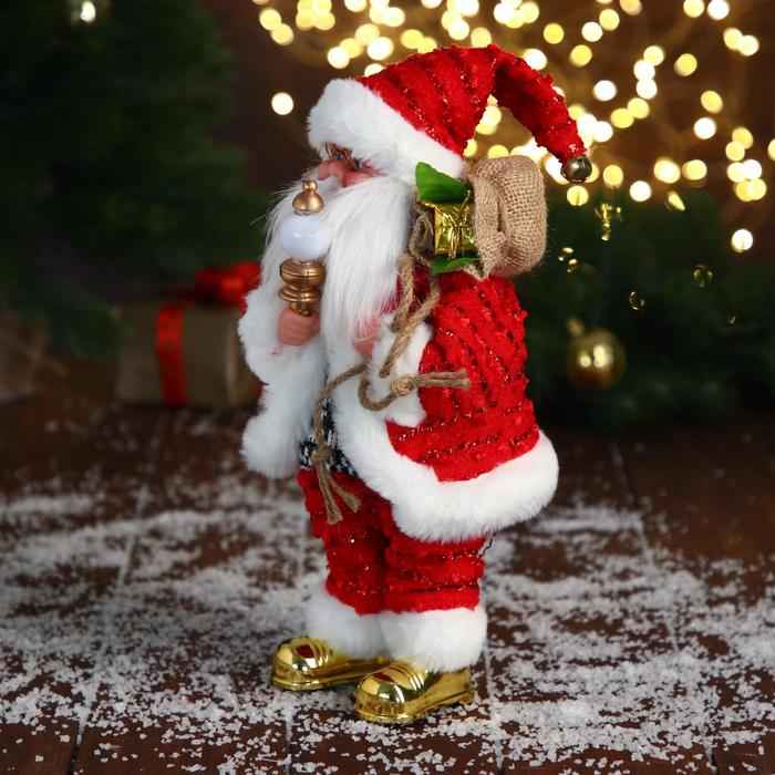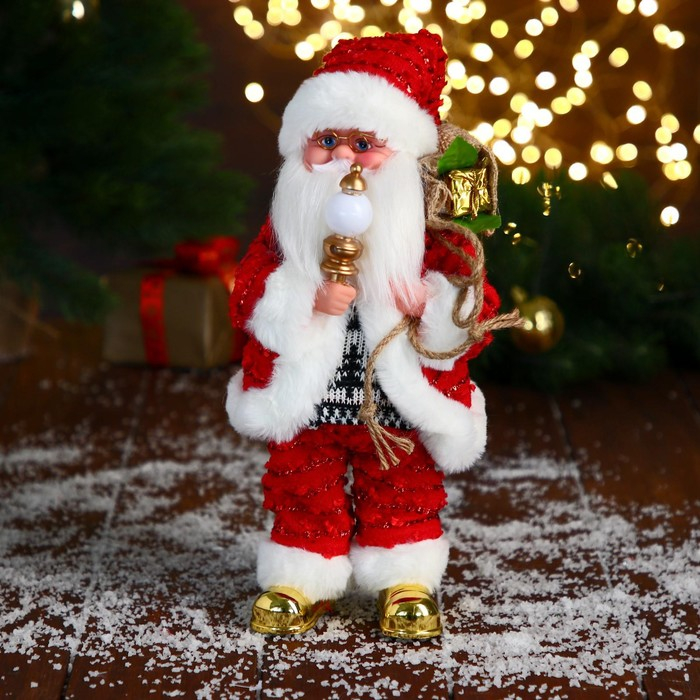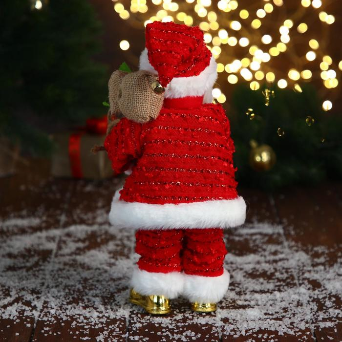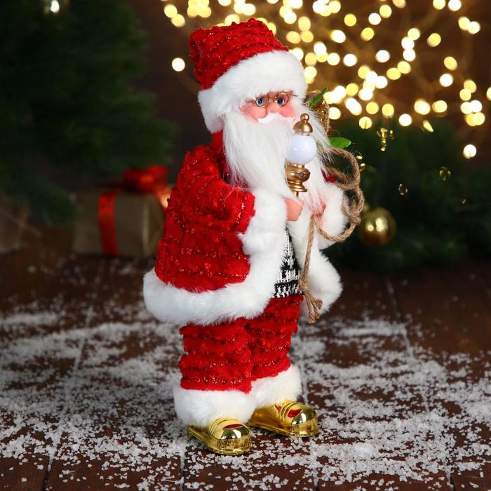 Дед Мороз "В свитере и блестящей шубке с белым мехом" двигается, лампа светится, 15х30 см