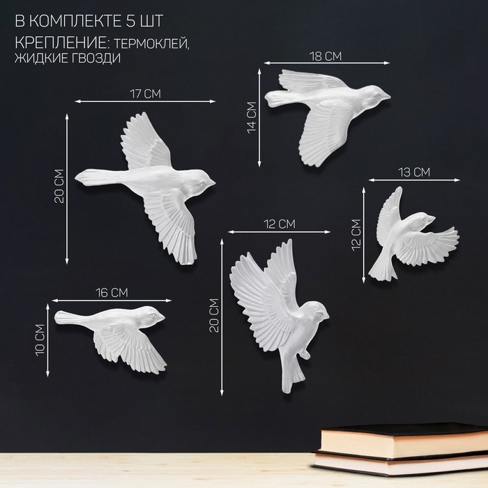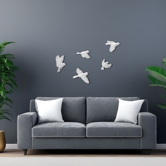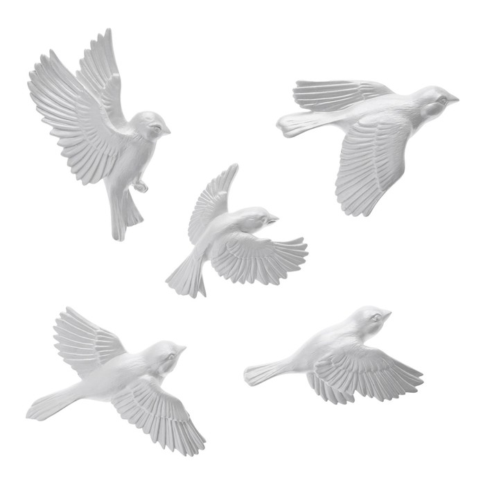 Декорация настенная, гипсовое панно "Птицы", 5 шт, серебристые
