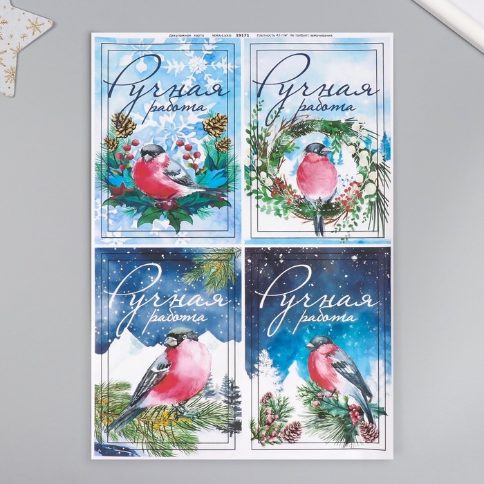 Декупажная карта "Снегири. Ручная работа" формат А4, плотность 45г/м2