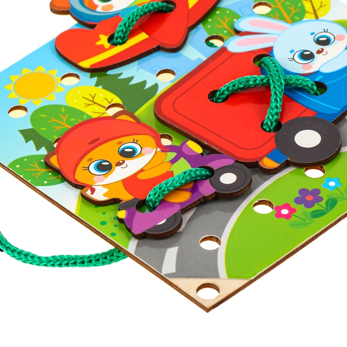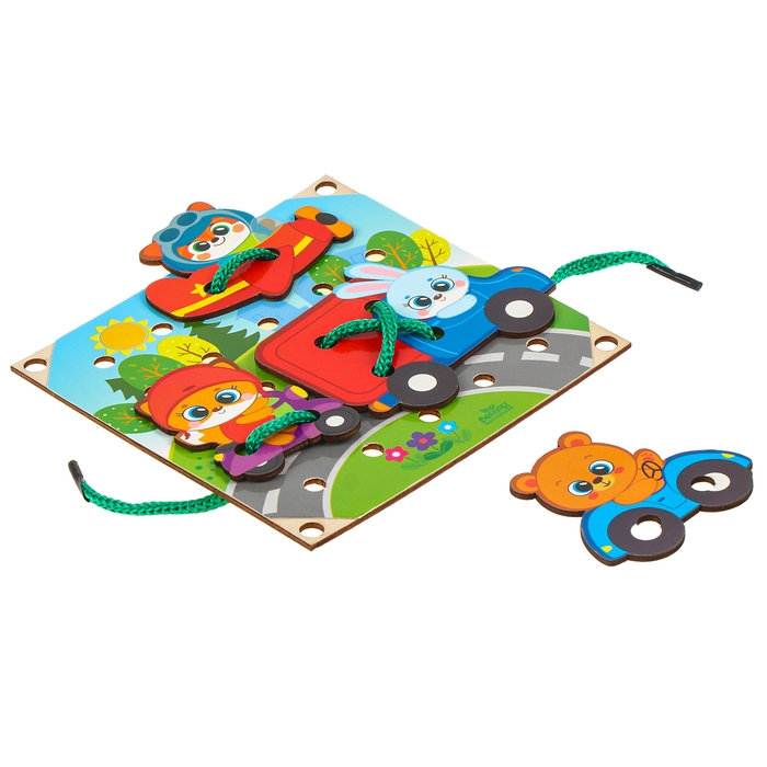 Во время игры малыш будет продевать шнурок сквозь отверстия в игровом поле, а также в фигурках. Покажите, что можно делать стежки, а также завязывать и развязывать узелки.