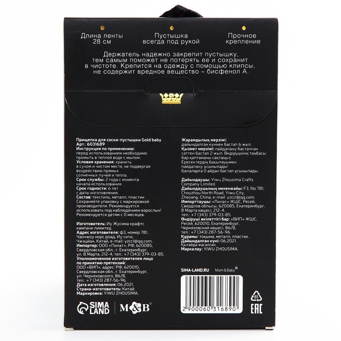 Прищепка для пустышки предотвратит потерю маленького предмета. Используйте специальный держатель, и соска всегда будет под рукой!Изделие фиксируется на одежде ребёнка. На конце цепочки есть карабин, который зацепляется за кольцо пустышки. Надёжное крепление убережёт вещь от падения на пол, если малютка случайно выронит её изо рта.С держателем можно играть, притягательный дизайн точно понравится малышу.Товар изготовлен из качественного нетоксичного материала. Подходит для деток с рождения.
