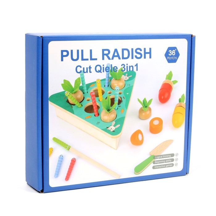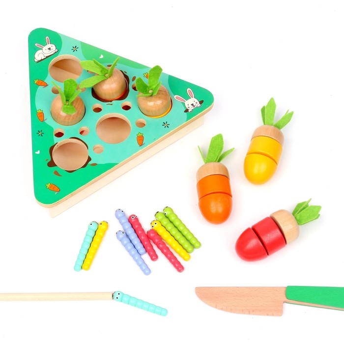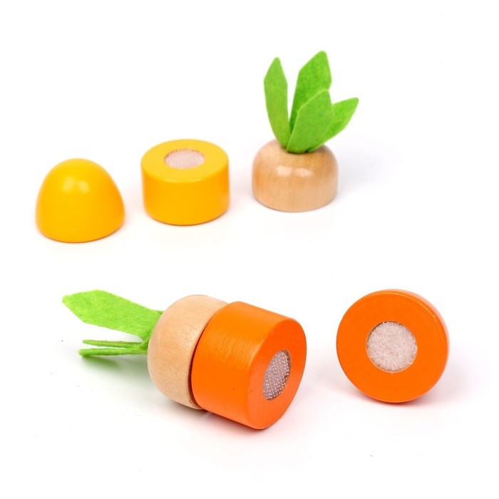 - «Режем овощи». С помощью деревянного ножа малыш «разрежет» морковки. Детали овоща скрепляются на липучки.