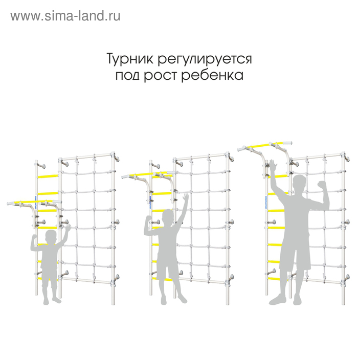 В комплексе есть подвижный турник, который можно перемещать по вертикали и фиксировать в подходящем под рост ребенка положении. Ручки на турнике, размещенные в двух направлениях, позволяют выполнять упражнения на различные группы мышц.