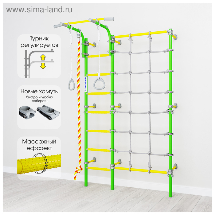 Канатный лаз сделан из шнура повышенной прочности и прекрасно развивает координацию и моторику. Установить его можно как слева, так и справа от лестницы. Массажные ступени, которые помогают развитию мелкой моторики и служат профилактикой плоскостопия. Крепкая рама выдерживает нагрузку до 100 кг (испытано на 200 кг).