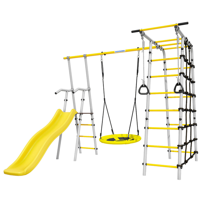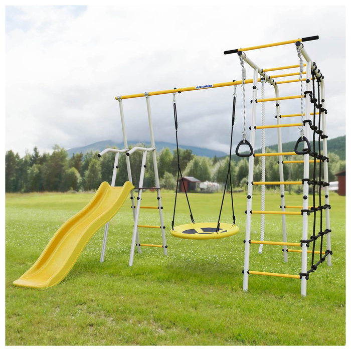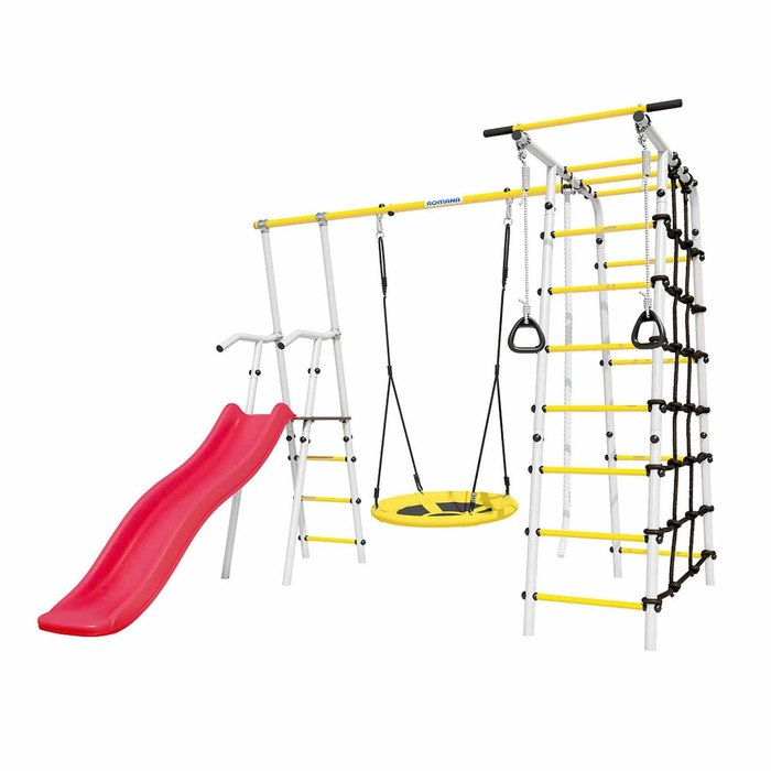 Спортивный комплекс подходит для установки на улице, например, на дачном участке. В комплект входит удобная и безопасная горка, рядом с которой располагаются качели. Другая часть комплекса состоит из лестницы и турника и канатного лаза, сделанного из шнура повышенной прочности. Также, предусмотрены гимнастические кольца