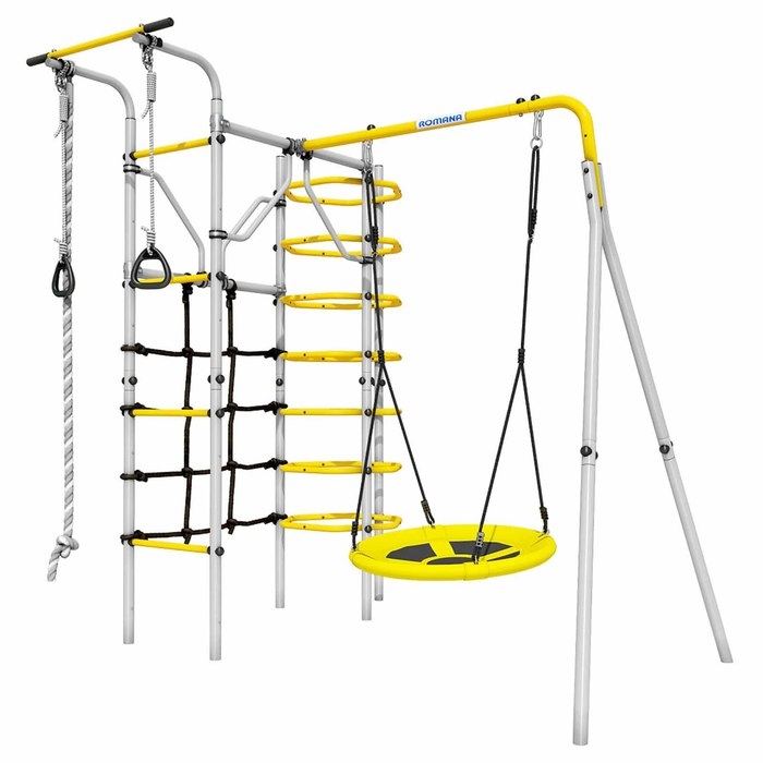 Комплекс включает в себя множество игровых элементов: кольцевой лаз, турник, сетку-лаз, канат, кольца и качели. Навесное оборудование устойчиво к атмосферным осадкам. Канат, сетку-лаз и кольца можно не заносить в дом после игр. Комплекс устанавливается методом бетонирования.