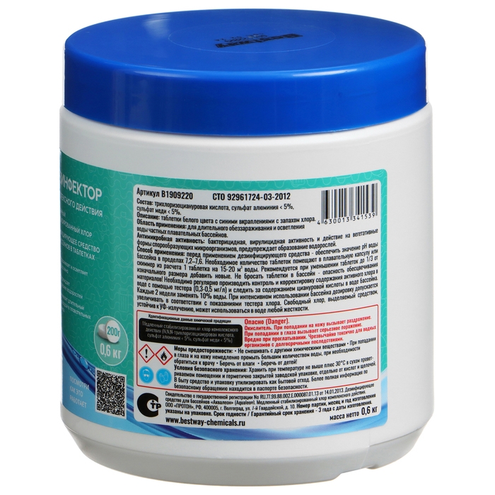 Дезинфектор комплексного действия Bestway, медленный стабилизированный хлор в таблетках предназначен для длительного обеззараживания и осветления воды частных плавательных бассейнов. Бактерицидная, вирулицидная активность и действие на вегетативные формы спорообразующих микроорганизмов, предупреждает образование водорослей. Свободный хлор, выделяемый средством, устойчив к УФ-излучению, может использоваться в воде любой жёсткости.