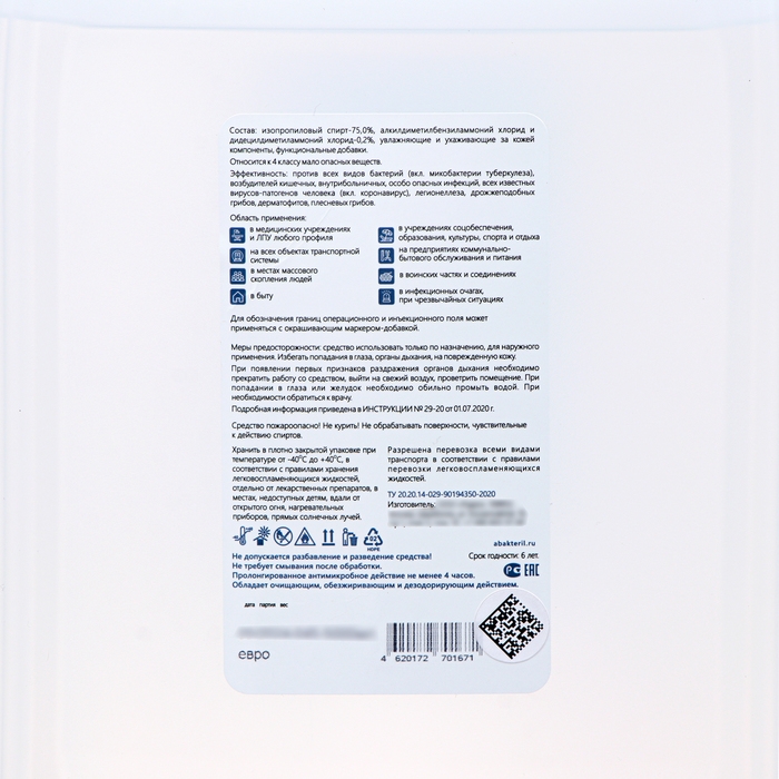 Способ применения: применяется при помощи различных дозирующих устройств, способных дозировать заданное количество жидкости, методом орошения (с использованием распылительных насадок), методом протирания – с использованием ватных или марлевых тампонов. Гигиеническая обработка рук: на сухие руки наносят 3 мл средства и втирают его в кожу в течение 30 секунд до полного высыхания кожных покровов. Для профилактики туберкулеза и вирусных инфекций обработку рук проводят дважды, используя каждый раз не менее 3 мл средства, общее время обработки – не менее 2 мин. Обработка рук хирургов, операционных медицинских сестер, акушерок и других лиц, участвующих в проведении операций, приеме родов: На предварительно вымытые руки наносят дважды по 5 мл средства отдельными порциями, равномерно распределяя и при этом тщательно втирая каждую порцию средства в кожу кистей рук и предплечий в течение 2,5 мин. Общее время обработки составляет 5 мин. Стерильные перчатки надевают после полного высыхания средства. Обработка кожи операционного поля, локтевых сгибов доноров, кожи перед введением катетеров и пункцией суставов: кожу двукратно протирают раздельными стерильными марлевыми тампонами, обильно смоченными средством; время выдержки после окончания обработки – 2 мин. Инъекционное поле протирают стерильным ватным тампоном, обильно смоченным средством или обильно орошают в месте инъекции с использованием распылительной насадки. Время выдержки после окончания обработки – 30 секунд. Для обеззараживания поверхности перчаток в сжатую ладонь руки в перчатке наносят 2,5 мл средства и в течение 15 секунд протирают поверхность перчаток обоих рук, затем повторяют те же действия для другой руки. Общее время обработки 30 секунд. Время дезинфекционной выдержки – 5 мин. Внутреннюю поверхность обуви оросить средством из распылителя до легкого увлажнения, либо протереть марлевыми салфетками, обильно смоченными в средством. Затем протереть чистой бумажной салфеткой и дать высохнуть. Время дезинфекционной выдержки – 5 мин. Резиновые коврики оросить средством из распылителя и выдержать 5 мин. Просушить. Норма расхода средства при дезинфекции небольших по площади поверхностей, не загрязненных биологическими выделениями – 40 мл/м2 обрабатываемой поверхности. Поверхности в помещениях, на санитарном транспорте, предметы обстановки, приборы, медицинское оборудование равномерно орошают средством с помощью распылительной насадки с расстояния 20 см до их полного смачивания или протирают марлевой салфеткой, обильно смоченной средством по режимам таблицы 1. Обработка влажными неткаными салфетками, проводится из расчета 1 салфетка (300 см2) на 0,2 м2 обрабатываемой поверхности. Режимы применения, время выдержки и применение средства «Абактерил-Актив» с использованием нетканых салфеток подробно изложены в инструкции по применению №1-13 от 23.12.2013 г. (см. вкладку Документация).