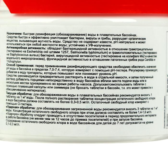 Назначение: предназначено для обеззараживания воды в системах хозяйственно-питьевого водоснабжения при централизованном водоснабжении; обеззараживания групповых запасов воды при нецентрализованном водоснабжении, а также емкостей для хранения воды, дезинфекции шахтных колодцев и обеззараживанию воды в них, обеззараживания воды плавательных бассейнов, дезинфекции различных объектов в помещениях бассейна (поверхности ванны бассейна, раздевальнях, душевых, резиновых ковриков, уборочного инвентаря и т.д.). Средство предназначено для применения специалистами предприятий, организаций, учреждений, деятельность которых связана с эксплуатацией плавательных бассейнов, а также работников дезинфекционных станций, других учреждений, имеющих право заниматься дезинфекционной деятельностью, населением в быту в соответствии с этикеткой для быта.