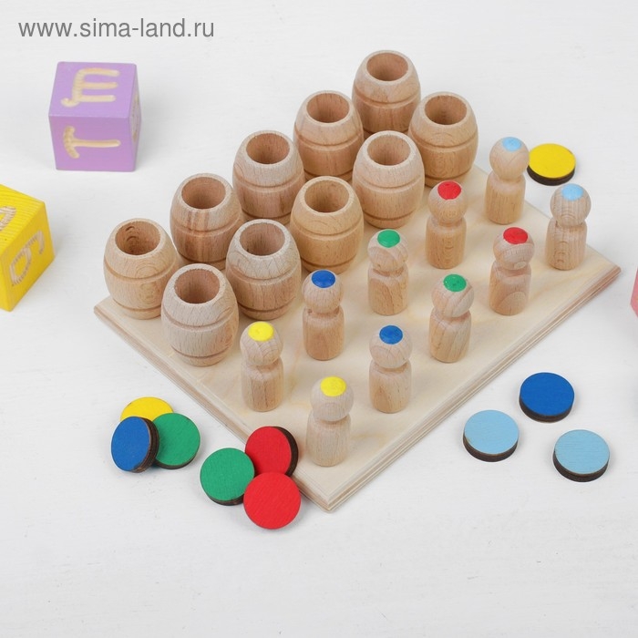 - «Военный десант». Игра, обратная предыдущей. На плоту в бочках сидят солдаты (цвет-вразнобой). Необходимо поставить человечков парами по цвету рядом со своими бочками. А бочки закрыть соответствующими крышками.