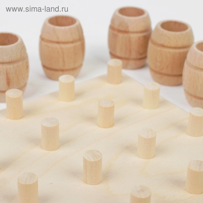 - «Кораблик тонет!» НА планшете-корабле плывут человечки. Там же расположены бочонки. Но вдруг начинается буря и корабль может утонуть. Задача малыша — спасти пассажиров, то есть снять с колышков бочонки, расставить на столе и каждого человечка пересадить с планшета в бочку, чтобы они не утонули вместе с кораблём.