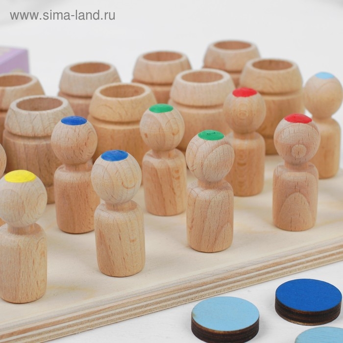 Игра состоит из планшета с колышками, десяти неокрашенных бочонков, десяти цветных кружков-крышечек и десяти человечков с разными по цвету кепочками (каждого цвета по два).