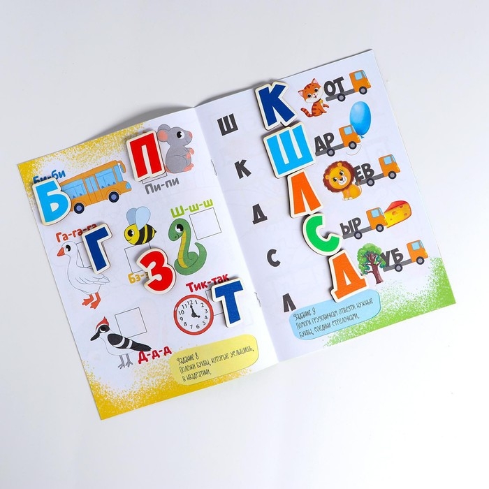 Во время игры у малыша задействуется сразу несколько уровней восприятия: слуховой (произношение букв), зрительный (картинки и цветные буквы), а также тактильный (малыш будем брать плашки с буквами и класть их на страницы журнала). Всё это способствует эффективному запоминанию информации.