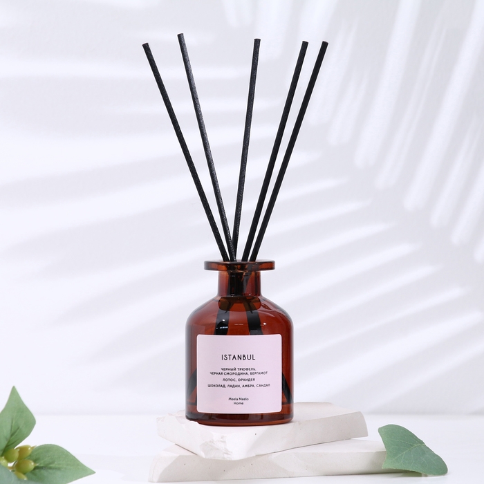 Диффузор ISTANBUL поставляется в стильной колбе из тёмного стекла, которая элегантно выглядит и при этом защищает содержимое от воздействия света. Качественная упаковка из гофрированного картона с подложкой обеспечивает безопасную доставку и подчёркивает уникальный стиль декора.
