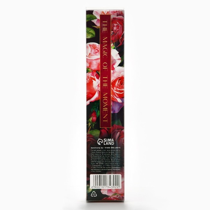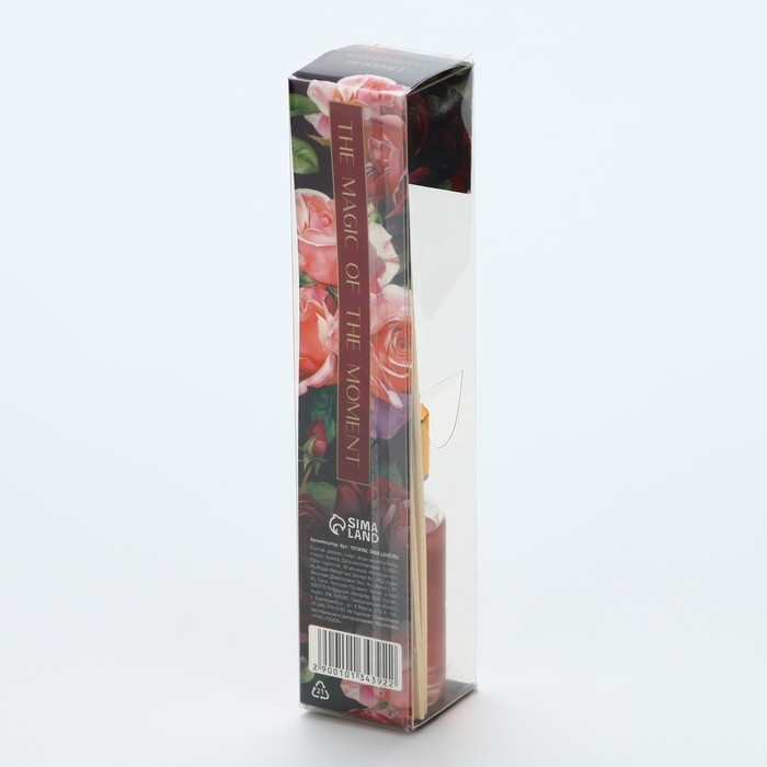 Диффузор упакован в стильную коробочку с изображением роз, что делает его прекрасным подарком для себя или близких. В комплект входят стеклянная бутылочка с ароматизированной жидкостью, деревянные палочки и декоративная упаковка. Палочки, вставленные в бутылочку, будут постепенно впитывать аромат и распространять его по комнате.