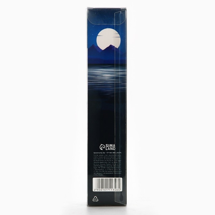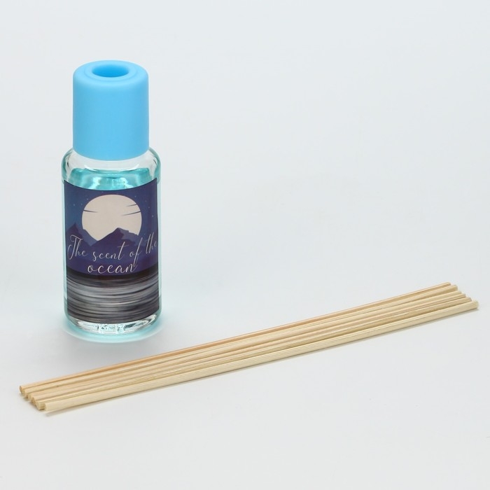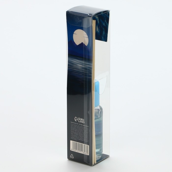 В прозрачной бутылочке из стекла находится 30 мл ароматической жидкости с ароматом океана. В комплект входят палочки из натурального дерева, которые, впитывая аромат, распространяют его по всему помещению. Диффузор упакован в красивую картонную коробку с изображением ночного пейзажа с морем и луной.