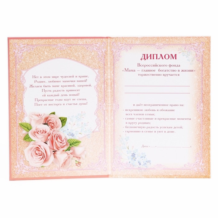 Тёплых слов не бывает слишком много. Отметить самые важные заслуги и напомнить о чувствах дорогому человеку поможет оригинальный диплом.