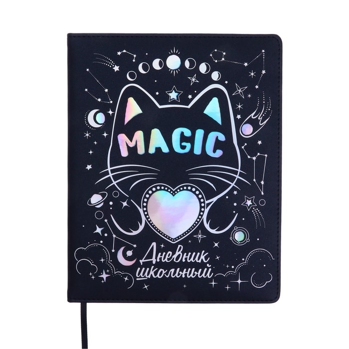 Дневник школьный для 1-11 классов "Меджик кот", твёрдая обложка с поролоном из искусственной кожи, перфорация + голографическая подложка, тиснение фольгой, 48 листов, блок офсет 80г/м2, универсальная шпаргалка