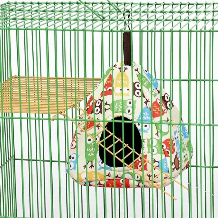 Домик подвесной, можно прикрепить к потолку клетки с помощью карабина.