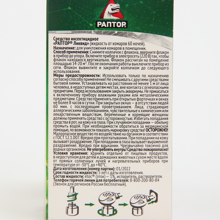 Дополнительный флакон-жидкость от комаров "Раптор", без запаха, 60 ночей