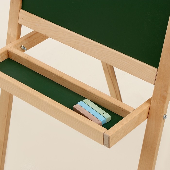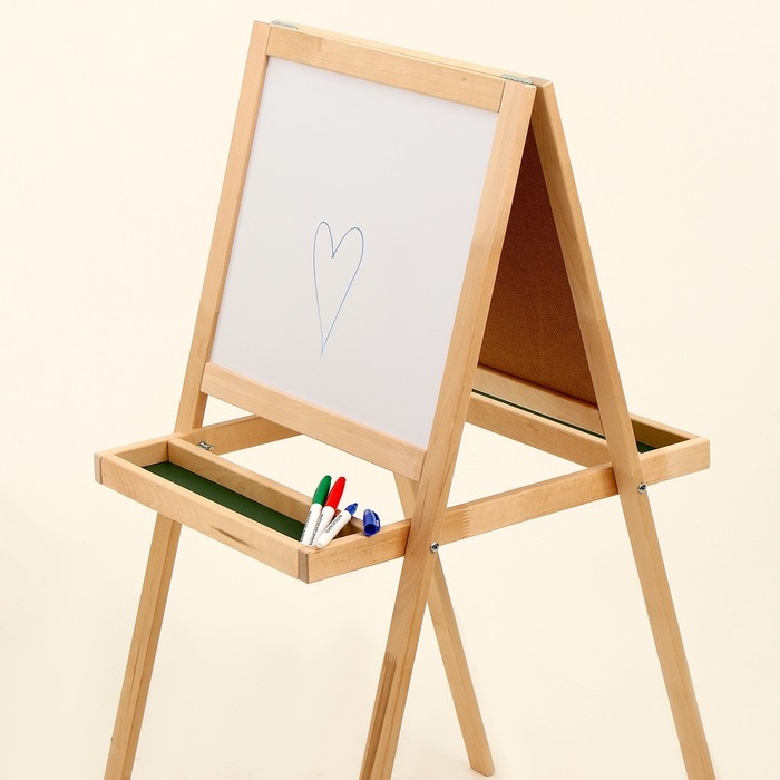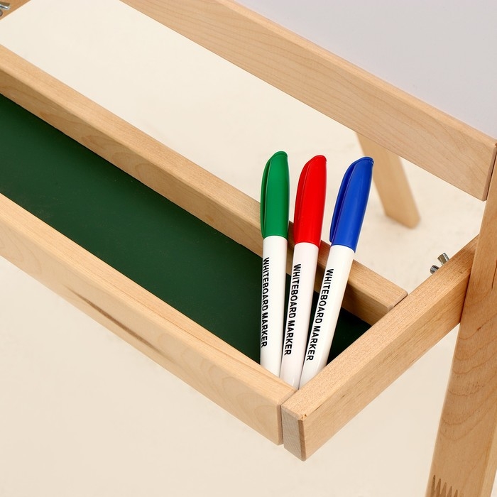 Доска изготовлена из безопасных материалов: дерева и пластика. Все углы и края тщательно обработаны, что исключает возможность травм. В комплект включены маркеры, мел и губка, что позволяет сразу начать использовать мольберт. Доска легко очищается, что обеспечивает долгий срок службы.