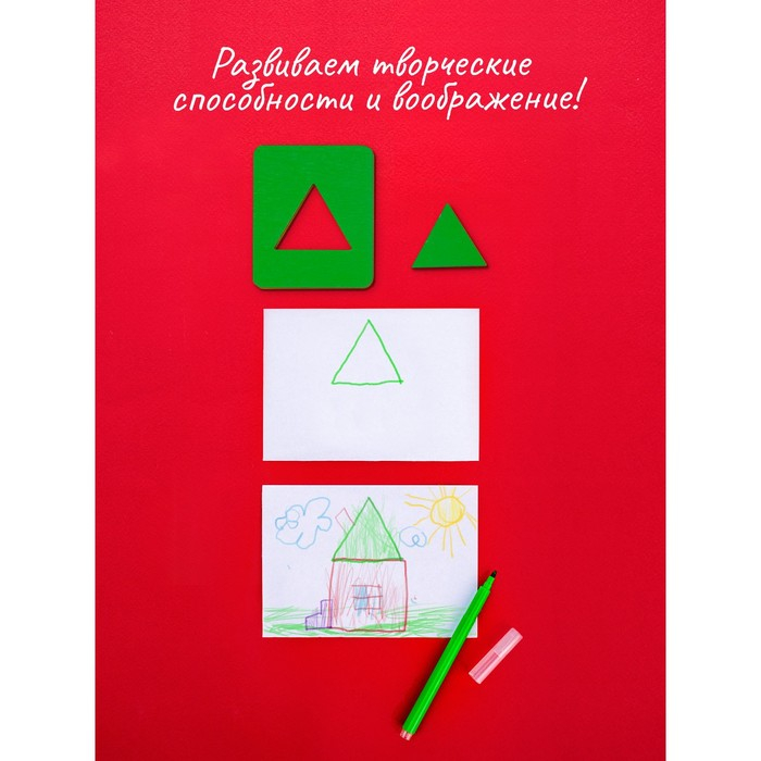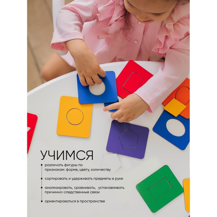 - 16 красочных досочек с геометрическими выемками: квадраты, овалы, круги, прямоугольники, ромбики, треугольники.