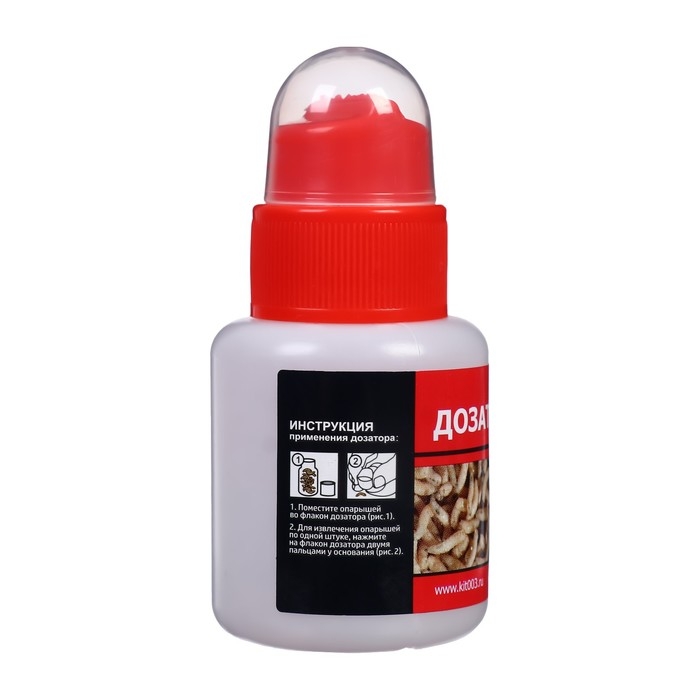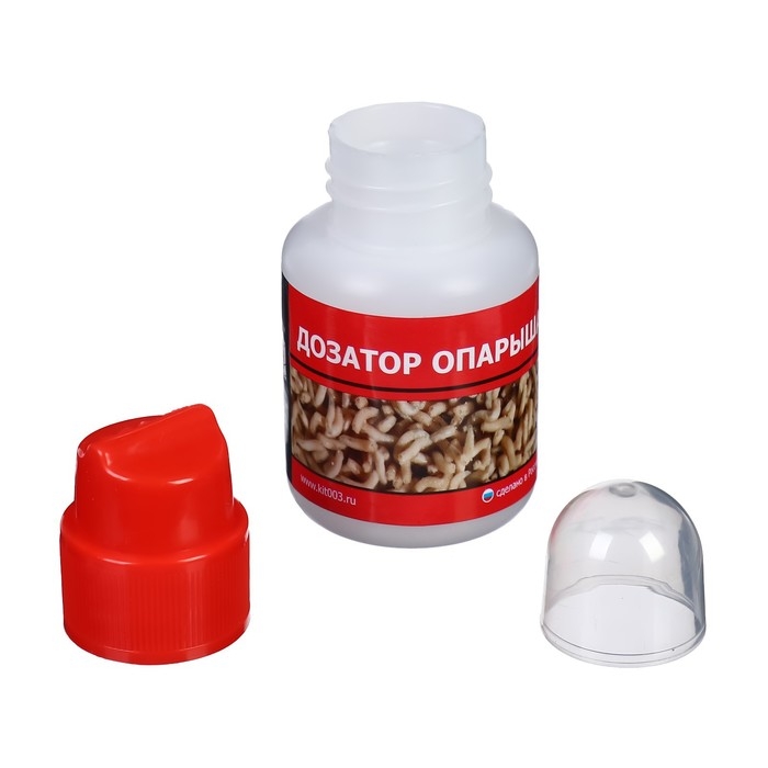Дозатор опарыша - это флакон со специальной завинчивающейся крышкой-дозатором и колпачком для надежной транспортировки и хранения живого опарыша и мотыля. Дозатор позволяет, не отставляя удочку, отмерить необходимое количество живого опарыша или мотыля одной рукой. Пересыпанный крахмалом мотыль также легко высыпается поштучно благодаря крышке-дозатору. В баночку не попадает влага, опарыш и мотыль сохраняются сухими всю рыбалку. Объём 70мл.