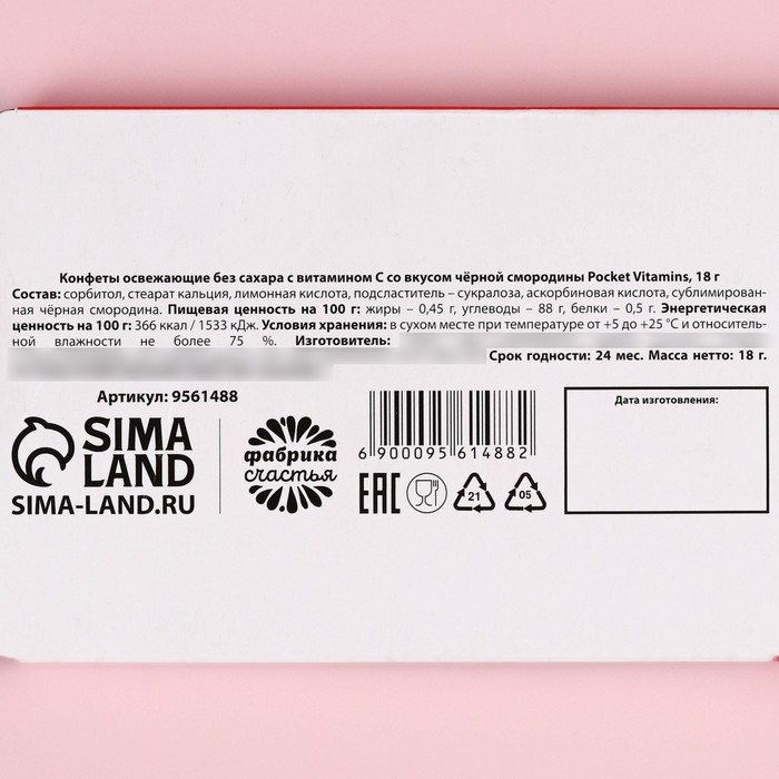 Состав: сорбитол, стеарат кальция, лимонная кислота, подсластитель - сукралоза, аскорбиновая кислота, сублимированная чёрная смородина.