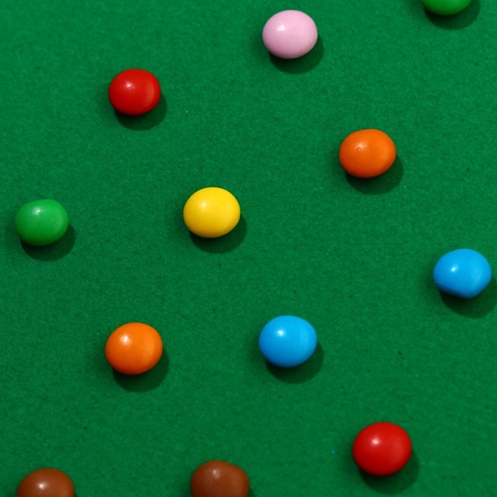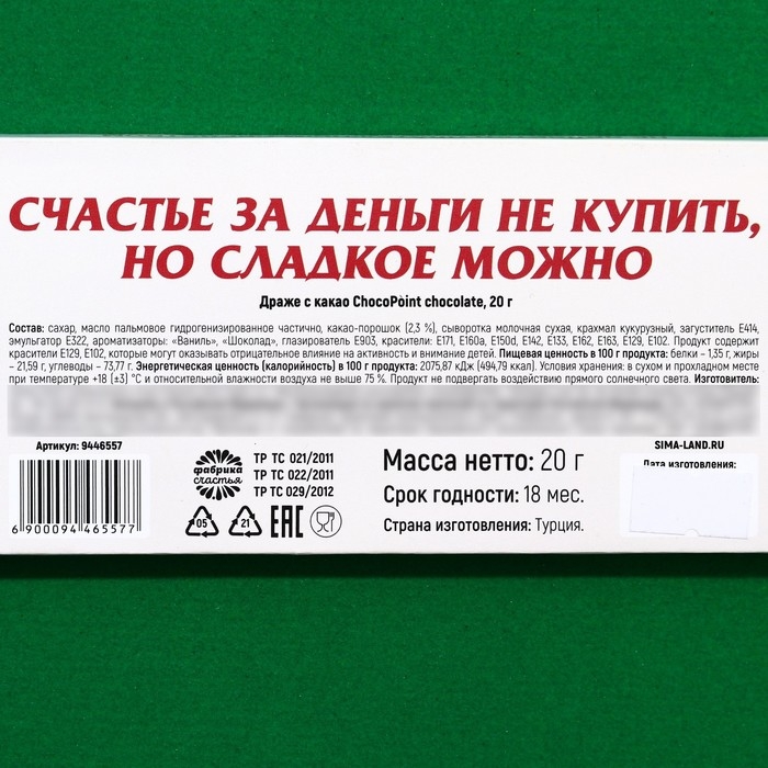 Состав: сахар, пальмовое масло, какао-порошок, кукурузный крахмал, сухое цельное молоко, стабилизатор (гуммиарабик), эмульгатор (соевый лецитин), глазирователь (карнаубский воск), ароматизаторы (ванилин, шоколад), красители (Е171, Е160а, Е150d, Е142, Е133, Е162, Е163, Е102, Е129).