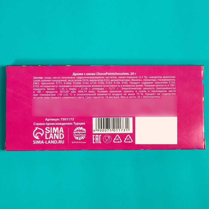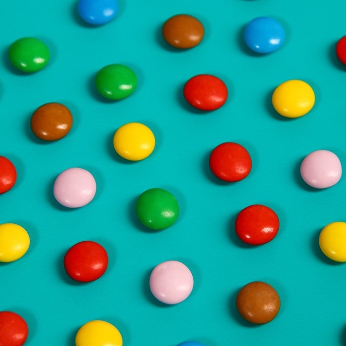 Состав: сахар, пальмовое масло, какао-порошок, кукурузный крахмал, сухое цельное молоко, стабилизатор (гуммиарабик), эмульгатор (соевый лецитин), глазирователь (карнаубский воск), ароматизаторы (ванилин, шоколад), красители (Е171, Е160а, Е150d, Е142, Е133, Е162, Е163, Е102, Е129).