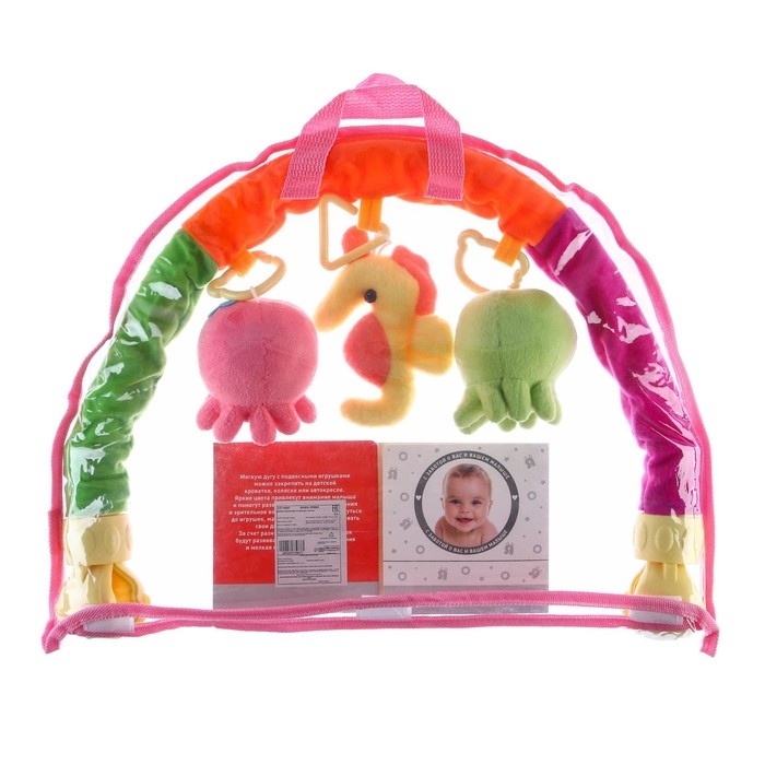 Эту дугу можно закрепить на детской кроватке, коляске или автокресле с помощью удобных прищепок. Угол наклона дуги регулируется. Сначала малыш будет просто рассматривать яркие игрушки, лежа на спинке, но со временем он обязательно начнет тянуться к ним ручками и ножками, совершенствуя свои двигательные навыки. Игрушки на дуге имеют различные цвета и формы, в том числе материал — специально для развития тактильных ощущений малышей. Изделие изготовлено из текстильных материалов с элементами пластмассы.