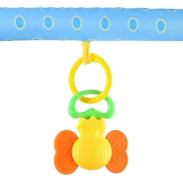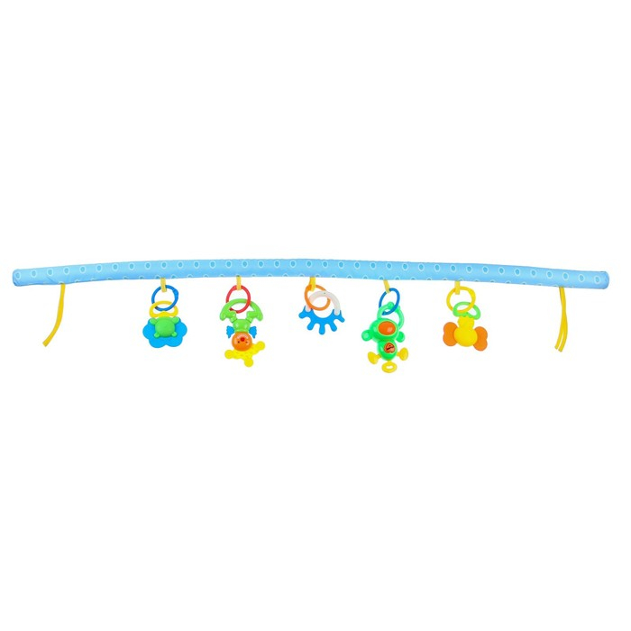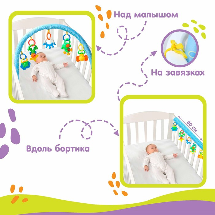 Эту дугу можно закрепить на детской кроватке, коляске или автокресле с помощью удобных завязок. Угол наклона дуги регулируется. Сначала малыш будет просто рассматривать яркие игрушки, лежа на спинке, но со временем он обязательно начнет тянуться к ним ручками и ножками, совершенствуя свои двигательные навыки. Игрушки на дуге имеют различные цвета и формы, в том числе материал — специально для развития тактильных ощущений малышей. Изделие изготовлено из текстильных материалов с элементами пластмассы.