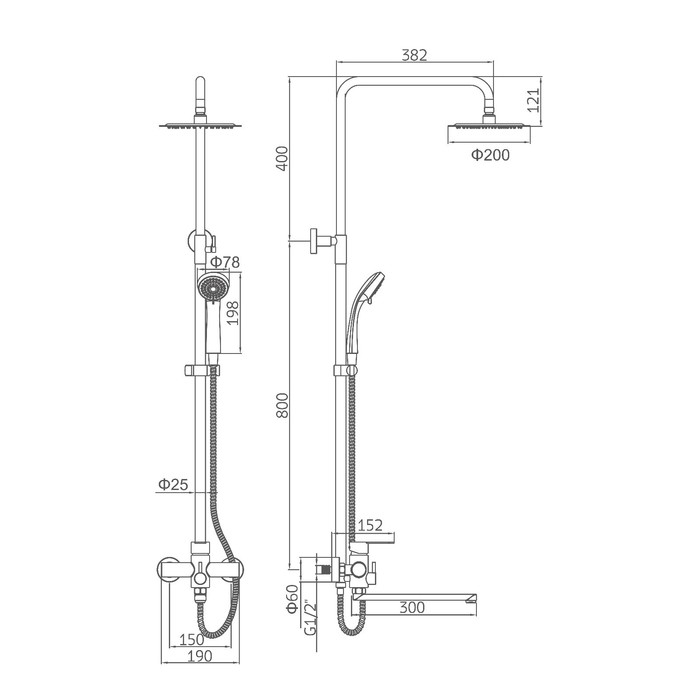 Душевая система Accoona A83103-2 представляет собой изогнутую штангу со стационарным верхним душем и мобильной лейкой на гибком шланге.