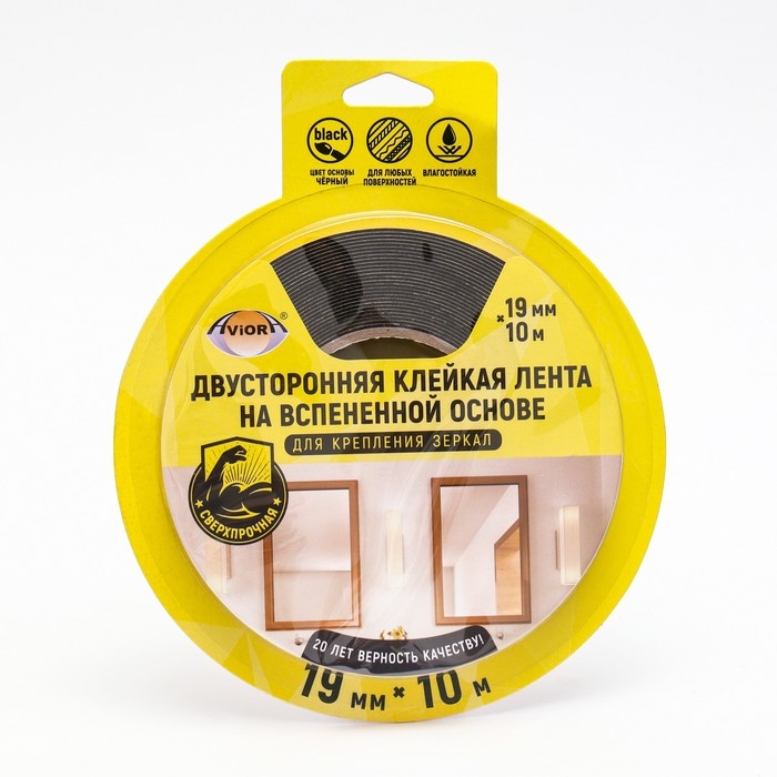 Двусторонняя клейкая лента на вспененной основе, 19 мм х 10 м, для крепления зеркал, чёрная,
