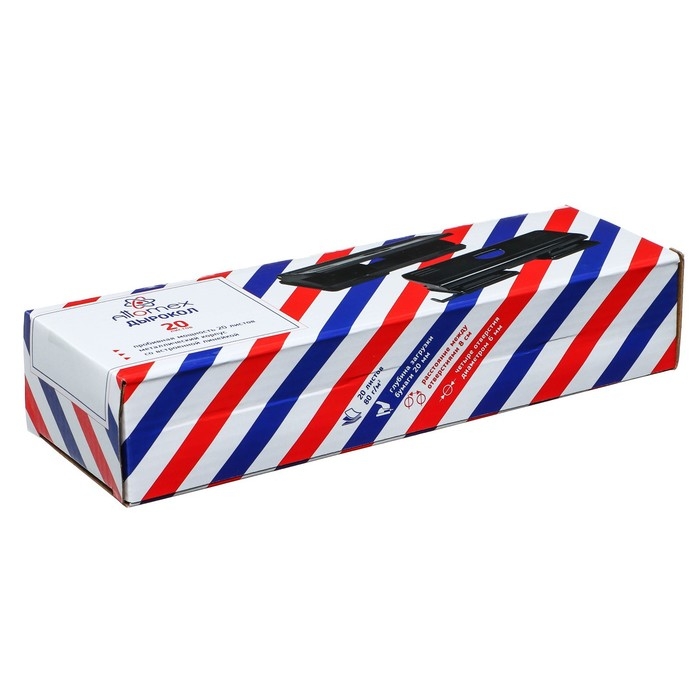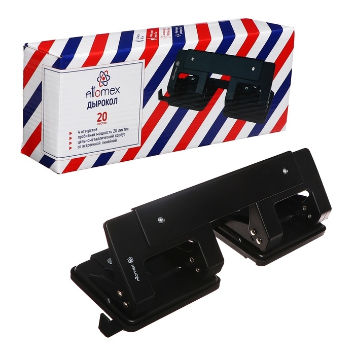 Дырокол Attomex на 4 отверстия (20 листов) металлический, со встроенной линейкой, в картонной коробке, черный