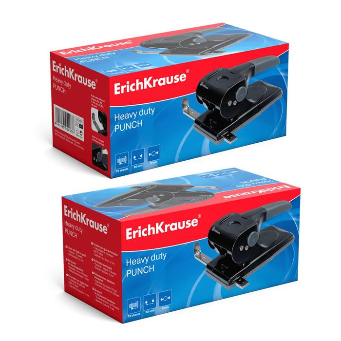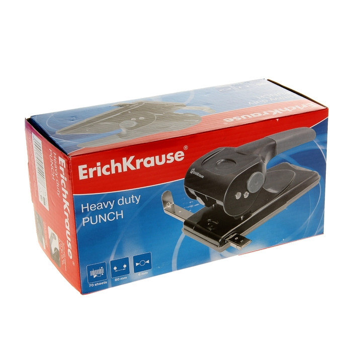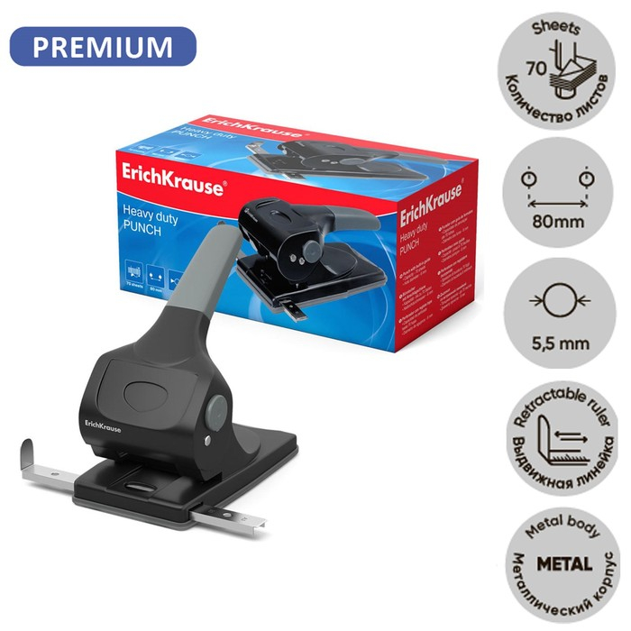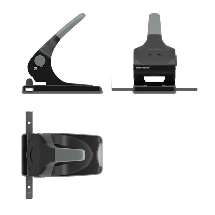 Дырокол мощный до 70 листов Erich Krause, с линейкой, серый, диаметр прокола 5.5мм, расстояние между проколами 80мм, чёрный