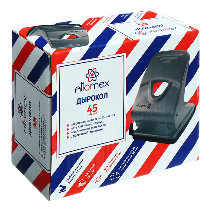Дырокол "Attomex" (45 листов) металлический, с линейкой, в картонной коробке, серый.