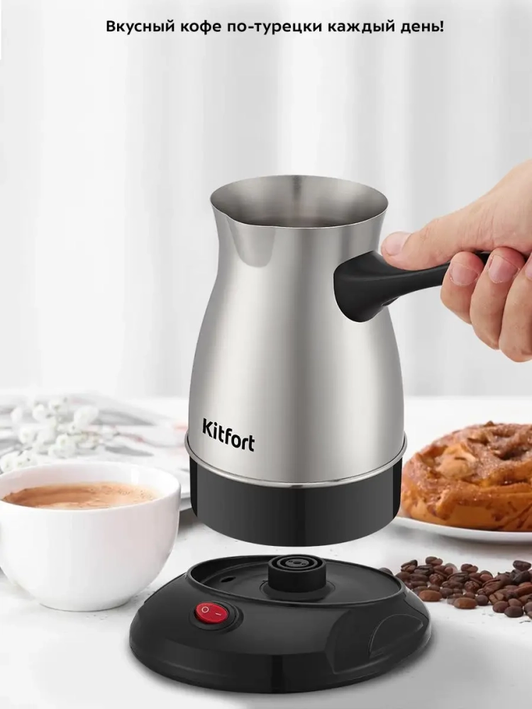 Электрическая турка Kitfort КТ-7131 варит кофе по-турецки. С ней вы сможете быстро и легко сварить натуральный кофе на 7 чашек по 60 мл. Устройство состоит из базы и турки.
