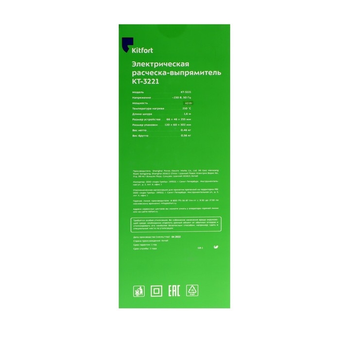 Электрическая расческа-выпрямитель Kitfort КТ-3221, 40 Вт, 210°C, шнур 1.6 м