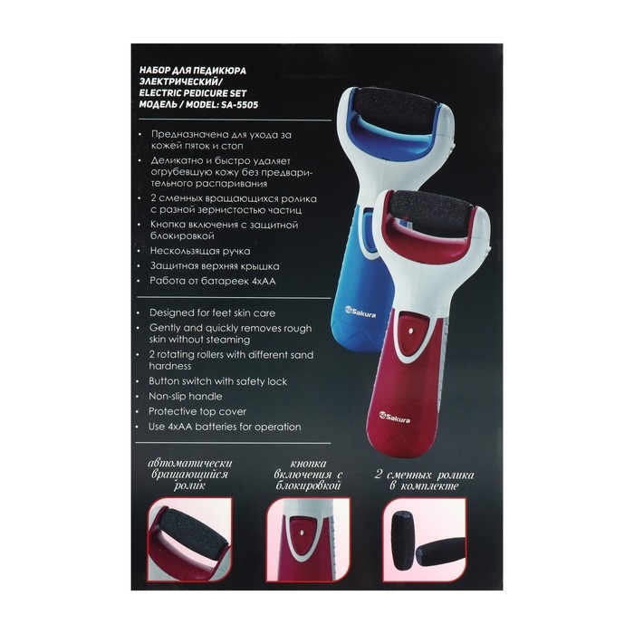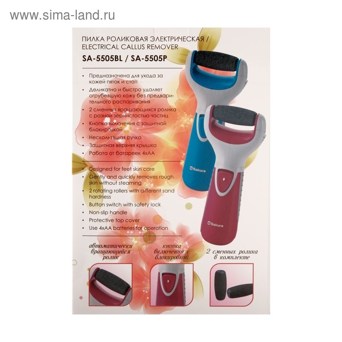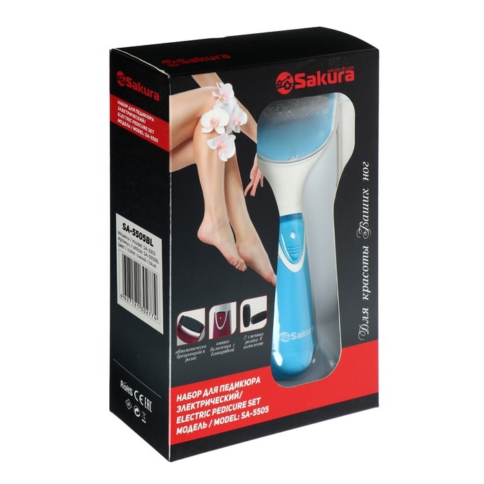 Электрическая роликовая пилка Sakura SA-5505BL, 2 насадки, 4хАА (не в компл.), голубая