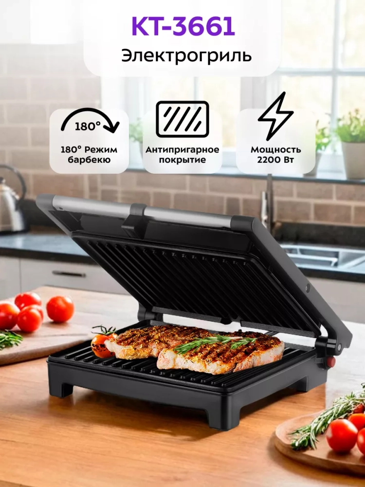 Электрогриль КТ-3661 двусторонний гриль электрический 2000Вт