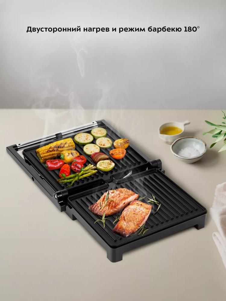 Конструкция гриля позволяет готовить в двух режимах: двустороннем и одностороннем. В двустороннем режиме электрогриль закрывается крышкой, так что продукты находятся между двух нагреваемых панелей и готовятся с двух сторон сразу. Такой способ позволяет сократить время готовки, а также не требует переворачивания продуктов во время приготовления. В одностороннем режиме крышка гриля откидывается на 180°, благодаря чему гриль превращается в большую жаровню, а продукты можно выложить сразу на две панели.