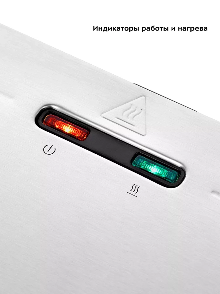 Гриль оснащен термостатом для поддержания температуры панелей, а также индикаторами работы и нагрева. Прорезиненные ножки не дают прибору скользить по столу во время готовки.