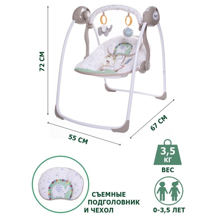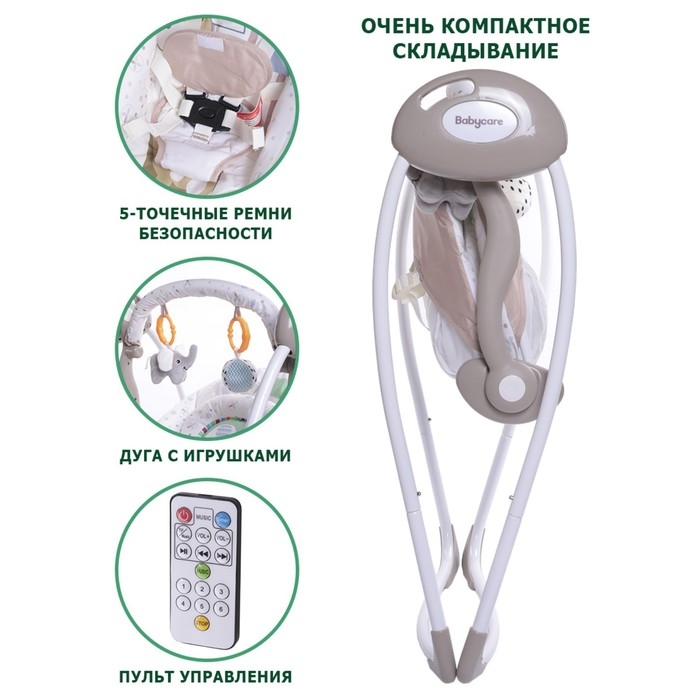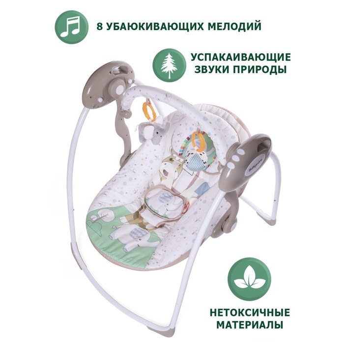 Яркие и легкие электрокачели SAFARI от Babycare станут отличным подарком молодым родителям малыш будет играть и спать и даст маме выпить свой кофе горячим! В удобном кресле из мягкого, приятного на ощупь материала малышу будет комфортно и безопасно лежать. Мобиль с двумя подвесными игрушками не даст малышу заскучать, а специальный режим с музыкой и звуками природы задаст настроение игре. Когда придет время отдохнуть, функция вибрации успокоит малыша и поможет ему заснуть. В элетрокачелях есть: пульт управления, 6 скоростей укачивания, узыкальный блок с 8 убаюкивающими мелодиями и регулировкой громкости. Съемная подушка-подголовник обеспечивает правильное положение ребенка и максимальный комфорт. Съемный чехол можно стирать в машине. Регулируемые 5-точечные ремни безопасности. Компактно складываются и занимают очень мало места при хранении, очень легкие. Работает от 4 батареек типа АА (не включены в комплект). Работает от сети, адаптер и пульт управления в комплекте.