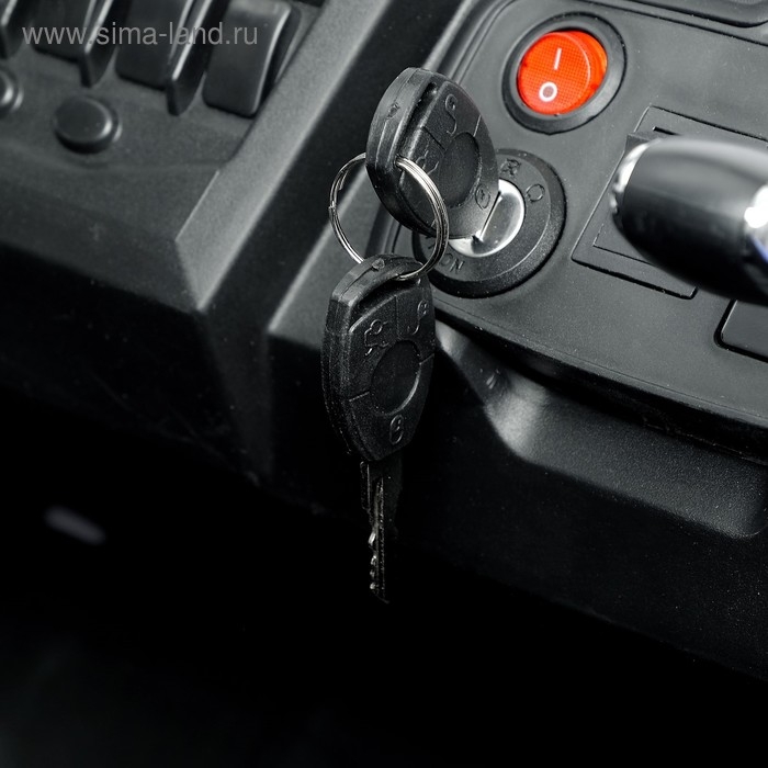 - На передней панели расположены кнопки управления, а также есть возможность подключить музыку в формате MP3 через USB или AUX. Справа за рулём находится ключ зажигания, при повороте которого электромобиль заведётся.