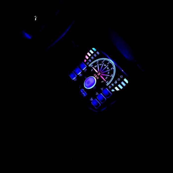 - Передняя панель подсвечивается. На ней находится аудиоплеер, где можно включить встроенную музыку или свою через USB и AUX.