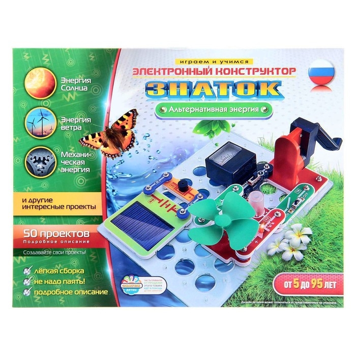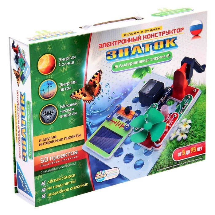 Электронный конструктор торговой марки «Знаток» познакомит ребёнка с альтернативными источниками энергии: солнечной, механической и ветровой. В комплект входит руководство пользователя по сборке 50 проектов. Проявив воображение, малыш придумает и реализует собственные схемы.