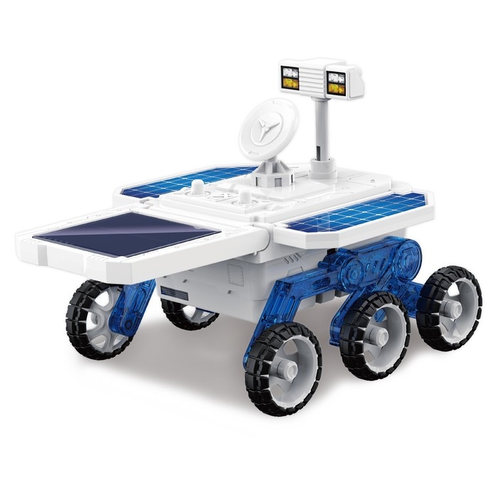 Чтобы собрать космический транспорт, необходимо, руководствуясь указаниями инструкции, последовательно соединить детали, подключить мотор и установить блок с элементами питания. Машина будет работать от двух источников энергии: солнечного света или 2 батареек типа АА (в комплект не входят).