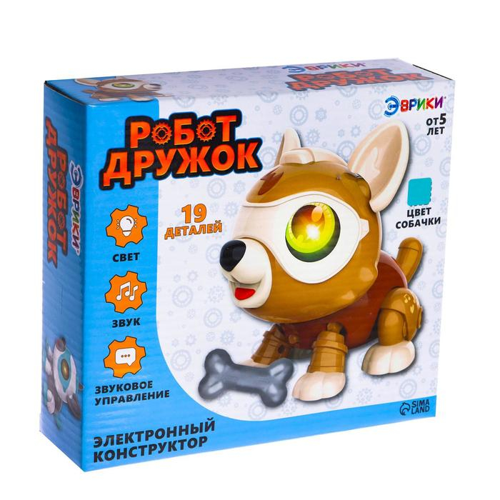 С электронным конструктором ребёнок соберёт весёлого питомца и с удовольствием поиграет с ним. Зверёк умеет ходить, поддерживает звуковое управление и очень любит косточки. Внутри у него есть сенсор, распознающий магниты.